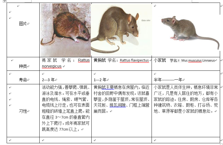 · 消殺階段:主要進行室內(nèi)、外重點區(qū)域投放安全的滅鼠餌劑,對不允許使用藥劑的區(qū)域,設置固定的粘捕設施,在鼠類活動的主要通道上,布放捕鼠設施,在短期內(nèi)降低鼠類的種群密度,使鼠密度控制在國家標準范圍內(nèi)。